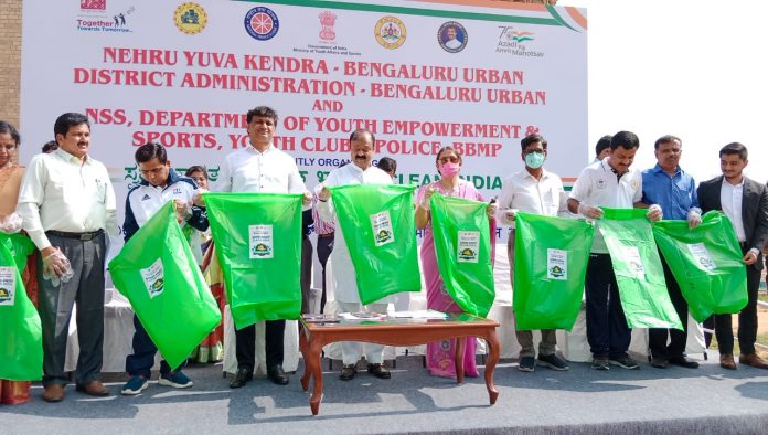 ಬೆಂಗಳೂರು, ಅ.22: ಬೆಂಗಳೂರಿನ ಅರಮನೆ ಆವರಣದಲ್ಲಿ ಆಜಾದಿ ಕಾ ಅಮೃತ್ ಮಹೋತ್ಸವ ಅಂಗವಾಗಿ ಹಮ್ಮಿಕೊಂಡಿದ್ದ ಕ್ಲೀನ್ ಇಂಡಿಯಾ ಕಾರ್ಯಕ್ರಮಕ್ಕೆ ರೇಷ್ಮೆ, ಯುವ ಸಬಲೀಕರಣ ಹಾಗೂ ಕ್ರೀಡಾ ಸಚಿವ ಡಾ.ನಾರಾಯಣ ಗೌಡ ಅವರು ಚಾಲನೆ ನೀಡಿದರು.