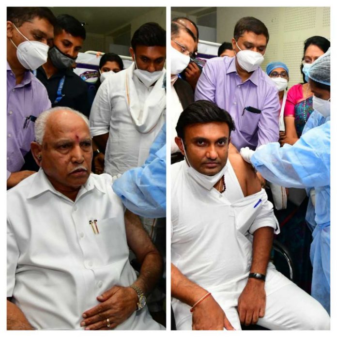 ಬೆಂಗಳೂರು: ಸಿಎಂ ಯಡಿಯೂರಪ್ಪ ಮತ್ತು ಆರೋಗ್ಯ ಸಚಿವ ಡಾ.ಕೆ.ಸುಧಾಕರ್ ಅವರು ವಿಕ್ಟೊರಿಯಾ ಆಸ್ಪತ್ರೆಯಲ್ಲಿ ಇಂದು ಕೊರೊನಾ ಲಸಿಕೆಯ ಮೊದಲನೇ ಡೋಸ್ ಪಡೆದರು.