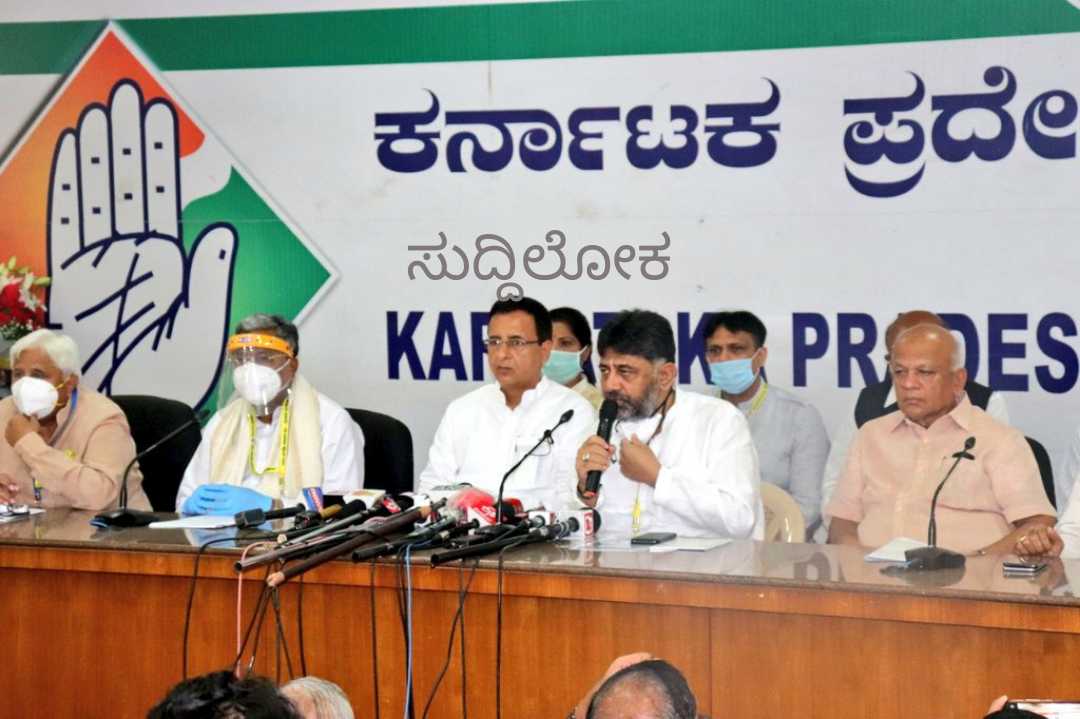 ಕ್ವೀನ್ಸ್ ರಸ್ತೆಯ ಕೆಪಿಸಿಸಿ ಕಚೇರಿಯಲ್ಲಿ ಕರ್ನಾಟಕ ಕಾಂಗ್ರೆಸ್ ಉಸ್ತುವಾರಿ ರಣದೀಪ್ ಸಿಂಗ್ ಸುರ್ಜೆವಾಲ, ಕೆಪಿಸಿಸಿ ಅಧ್ಯಕ್ಷ ಡಿ.ಕೆ ಶಿವಕುಮಾರ್ ಹಾಗೂ ವಿಧಾನಸಭೆ ವಿರೋಧ ಪಕ್ಷದ ನಾಯಕ ಸಿದ್ದರಾಮಯ್ಯ ಅವರು ಬುಧವಾರ ಪತ್ರಿಕಾಗೋಷ್ಠಿ ನಡೆಸಿ ಸರ್ಕಾರದ ವಿರುದ್ಧ ಟೀಕಾ ಪ್ರಹಾರ ನಡೆಸಿದರು.