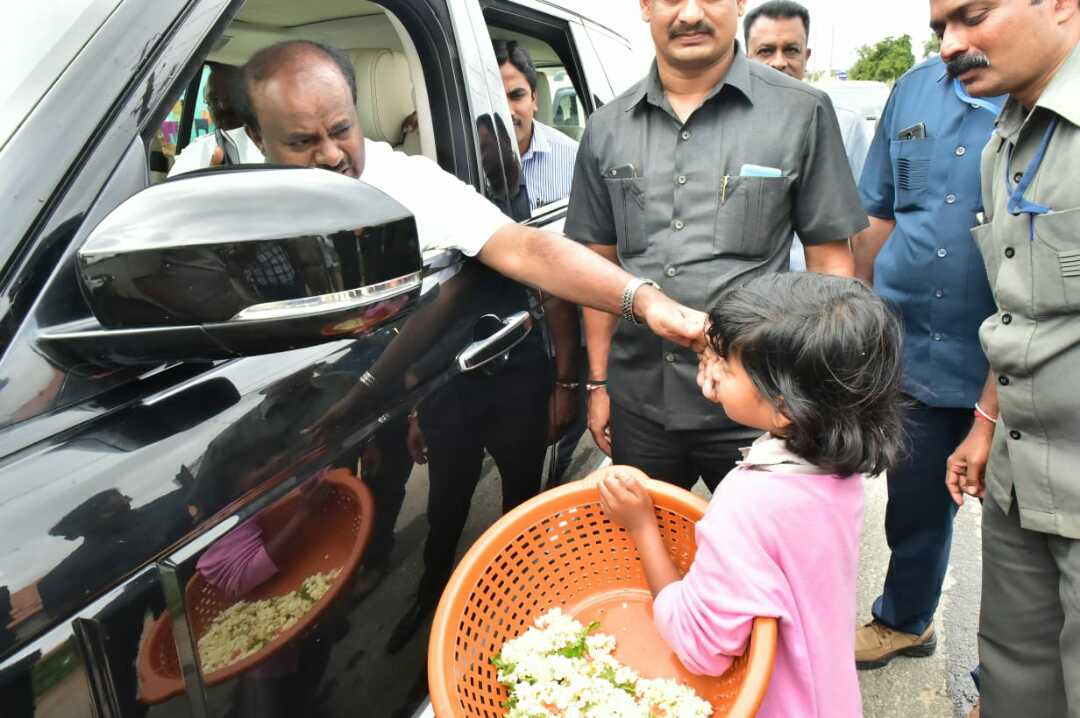 ರಾಮನಗರ: ಕೆಆರ್ಎಸ್ ನಿಂದ ರಾಮನಗರಕ್ಕೆ ಹೋಗುವ ಮಾರ್ಗ ಮದ್ಯದಲ್ಲಿ ಹೂ ಮಾರುತ್ತಿದ್ದ ಪುಟ್ಟ ಬಾಲಕಿಯನ್ನ ನೋಡಿದ ಸಿಎಂ ಕುಮಾರಸ್ವಾಮಿ ಕಾರು ನಿಲ್ಲಿಸಿ ಮಾತನಾಡಿಸಿ ವಿದ್ಯಾಭ್ಯಾಸಕ್ಕೆ ನೆರವು ನೀಡುವುದಾಗಿ ಭರವಸೆ ನೀಡಿದರು.