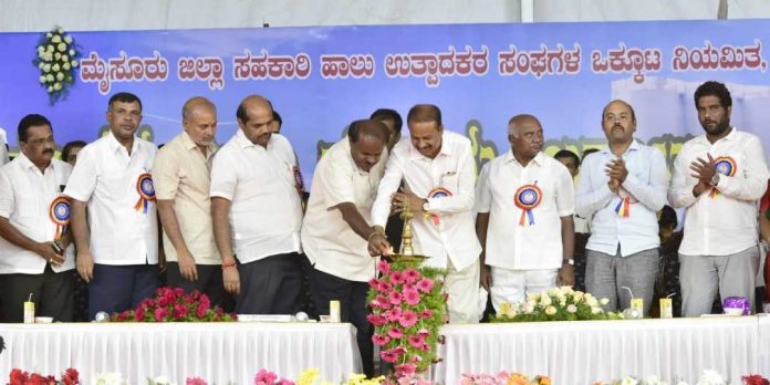 ಮೈಸೂರು: ಪ್ರತಿದಿನ 6 ಲಕ್ಷ ಲೀಟರ್ (9 ಲಕ್ಷ ಲೀಟರ್ಗೆ ವರ್ಧಿಸಬಹುದಾದ) ಹಾಲನ್ನು ಸಂಸ್ಕರಿಸುವ ಸಾಮರ್ಥ್ಯವುಳ್ಳ ನೂತನ ಮೆಗಾಡೇರಿಯನ್ನು ಮುಖ್ಯಮಂತ್ರಿ ಹೆಚ್.ಡಿ ಕುಮಾರಸ್ವಾಮಿ ಅವರು ಇಂದು ಮೈಸೂರು ನಗರದ ಆಲನಹಳ್ಳಿಯಲ್ಲಿ ಇಂದು ಉದ್ಘಾಟಿಸಿದರು.