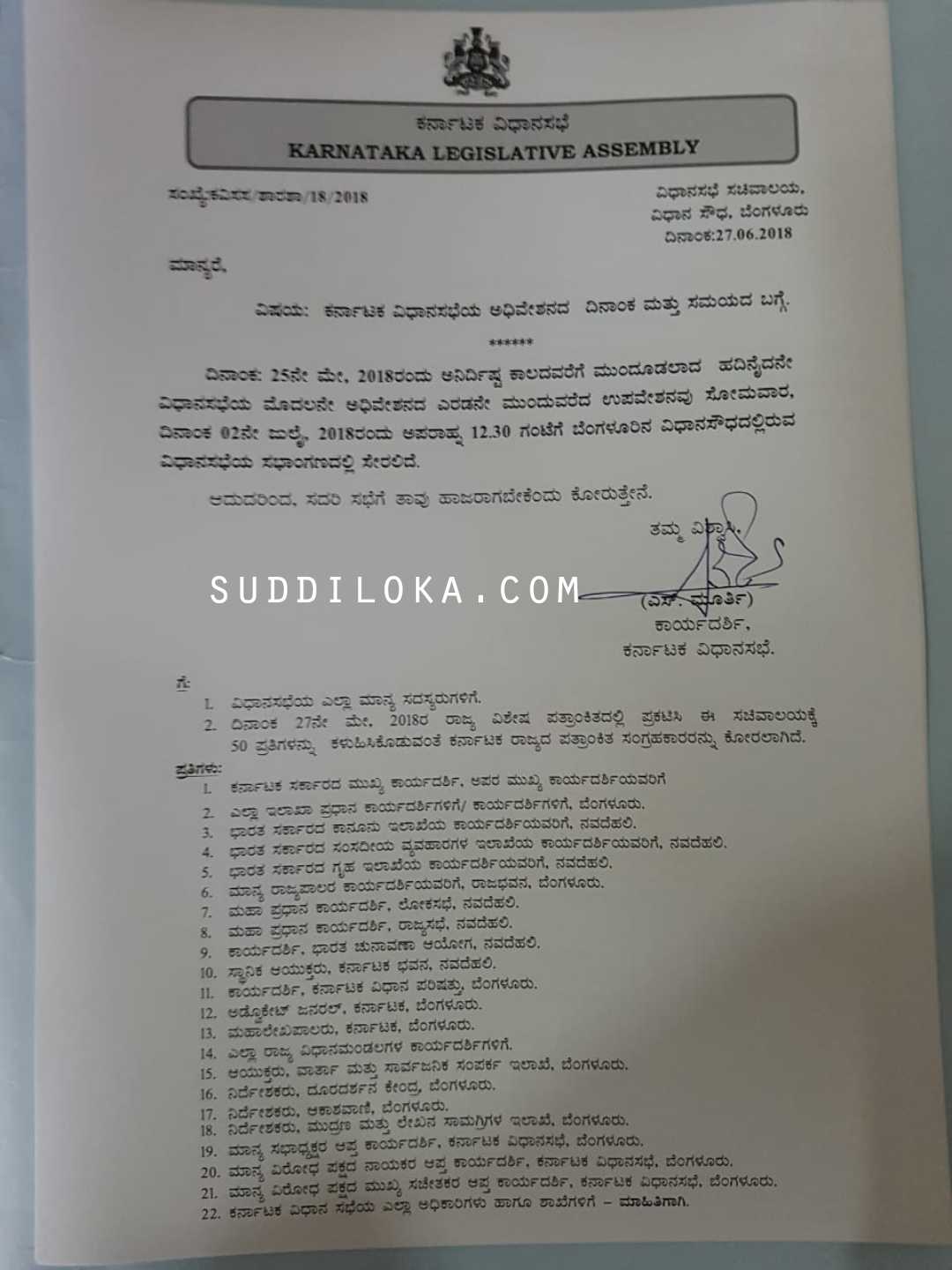 ಸ್ಪೀಕರ್ ಕೆ ಆರ್ ರಮೇಶ ಕುಮಾರ್ ಸೂಚನೆ ಮೇರೆಗೆ ವಿಧಾನಸಭೆ ಕಾರ್ಯದರ್ಶಿ ಎಸ್ ಮೂರ್ತಿ ಸಮನ್ಸ್ ಜಾರಿಗೊಳಿಸಿದ್ದು,ಜುಲೈ 2 ರಂದು ಮಧ್ಯಾಹ್ನ 12.30ಕ್ಕೆ ವಿಧಾನಸೌಧದ ವಿಧಾನಸಭೆಯ ಸಭಾಂಗಣದಲ್ಲಿ ಜಂಟಿ ಅಧಿವೇಶನ ಆರಂಭವಾಗಲಿದೆ,ರಾಜ್ಯಪಾಲ ವಜುಭಾಯ್ ವಾಲಾ ಭಾಷಣ ಮಾಡಲಿದ್ದು ಎಲ್ಲಾ ಶಾಸಕರು ಹಾಜರಿರುವಂತೆ ಸೂಚನೆ ನೀಡಲಾಗಿದೆ.