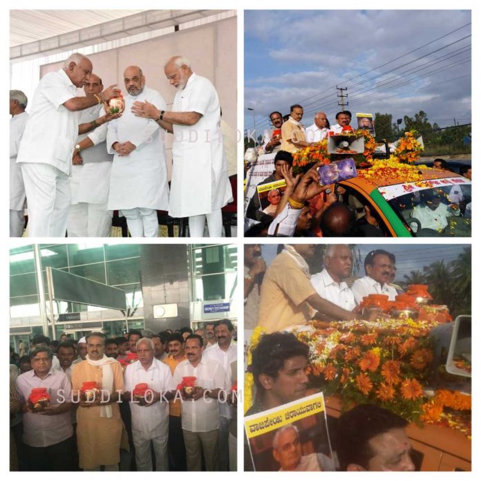 ನಂತರ ಬೆಂಗಳೂರು ಕಡೆ ಹೊರಟ ಯಡಿಯೂರಪ್ಪ ಸಂಜೆ ಕೆಂಪೇಗೌಡ ಅಂತಾರಾಷ್ಟ್ರೀಯ ವಿಮಾನ ನಿಲ್ದಾಣ ತಲುಪಿದರು.ಪಕ್ಷದ ಮುಖಂಡರು ಅಸ್ಥಿ ಕಲಶವನ್ನು ಸ್ವಾಗತಿಸಿದ್ದು, ರಾಜ್ಯ ಬಿಜೆಪಿ ಕಾರ್ಯಾಲಯದ ವರೆಗೆ ಸಾವಿರಾರು ಬಿಜೆಪಿ ಕಾರ್ಯಕರ್ತರು ಅಸ್ಥಿಕಲಶವನ್ನು ಮೆರವಣಿಗೆಯಲ್ಲಿ ಬಿಜೆಪಿ ಕಚೇರಿಗೆ ತರಲಾಯಿತು. ಇಂದು ರಾತ್ರಿಯ ವರೆಗೆ ಪಕ್ಷದ ಕಾರ್ಯಾಲಯದಲ್ಲಿ ಪುಷ್ಪಾರ್ಚನೆ ಮಾಡಲಿದ್ದು ನಾಳೆಯಿಂದ ರಾಜ್ಯದ ಪವಿತ್ರ ನದಿಗಳಲ್ಲಿ ಅಸ್ಥಿ ಕಲಶ ಬಿಡಲಾಗುತ್ತದೆ.